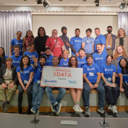2024 School of Data Volunteers pose together on a stage in an auditorium at CUNY School of Law.